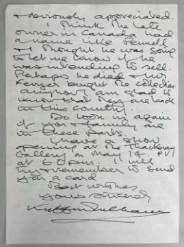 Notwithstanding any other terms of these Conditions, if within fourteen days after the sale Rogers Jones & Co have received from the buyer of any lot notice in writing that in his view the lot is a deliberate forgery and within seven days after such notification the buyer returns the same to Rogers Jones & Co, in the same condition as at the time of sale and by producing evidence, the burden of proof to be upon the buyer, satisfies Rogers Jones & Co that considered in the light of the entry in the catalogue the lot is a deliberate forgery then the sale of the lot will be rescinded and the purchase price of the same refunded.  The vendor agrees to be bound by Rogers Jones & Co’s decision.
