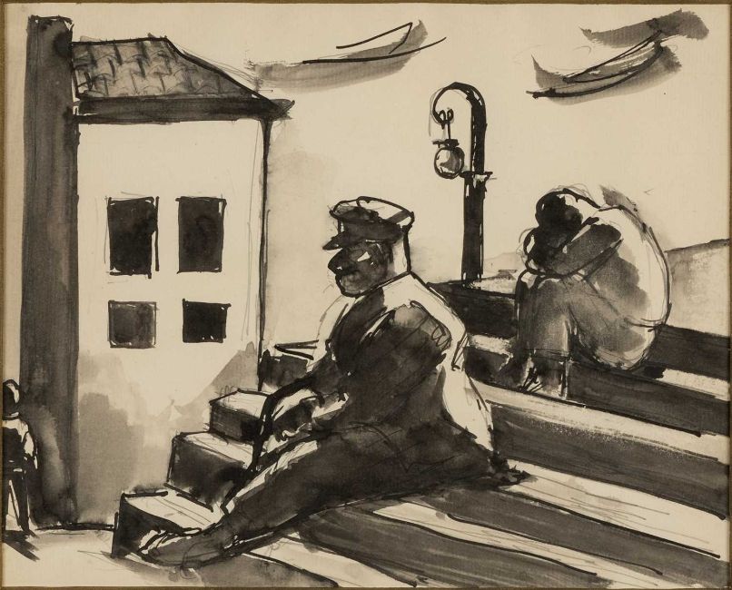 ‡ JOSEF HERMAN (Polish, lived Wales 1911-2000) pencil, ink and wash - figure in sailor cap sat upon steps alongside sobbing child, 20 x 24cmsProvenance: private collection LondonComments: framed and glazed