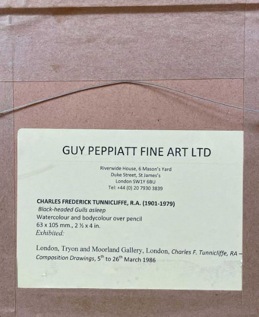 ‡ CHARLES FREDERICK TUNNICLIFFE RA OBE (English, worked Wales 1901-1979) watercolour and pencil - entitled verso, 'Black-Headed Gulls Asleep', on Guy Peppiatt Fine Art Gallery London label, circa 1960s, 6 x 10cmsProvenance: as per label verso, exhibited at the Tryon and Moorland Gallery London, Charles F. Tunnicliffe RA Composition Drawings, 5th to 26th March 1986. Private collection PowysComments: framed and glazed, ready to hang