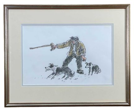‡ SIR KYFFIN WILLIAMS RA (Welsh 1918-2006) pencil and watercolour - entitled verso, 'Farmer with Sheepdogs' on Thackeray Gallery label verso, later signed in full on address card verso, 28 x 42cmsProvenance: private collection PowysComments: framed and glazed, ready to hangFree Delivery: bidders with invoices over £4000 in this Welsh Sale can benefit from free insured delivery to their home (England and Wales only). To enquire about this service, please email brj@rjauctions.co.uk