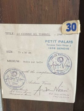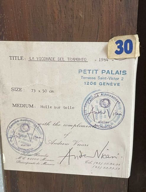 ‡ ANDREW VICARI (Welsh 1932-2016) oil on canvas - entitled verso 'La vigonad del tramoto' on Monaco address label, dated verso 1984, signed, 48 x 71cmsProvenance: private collection London, friend and business associate of the artistComments: framed
