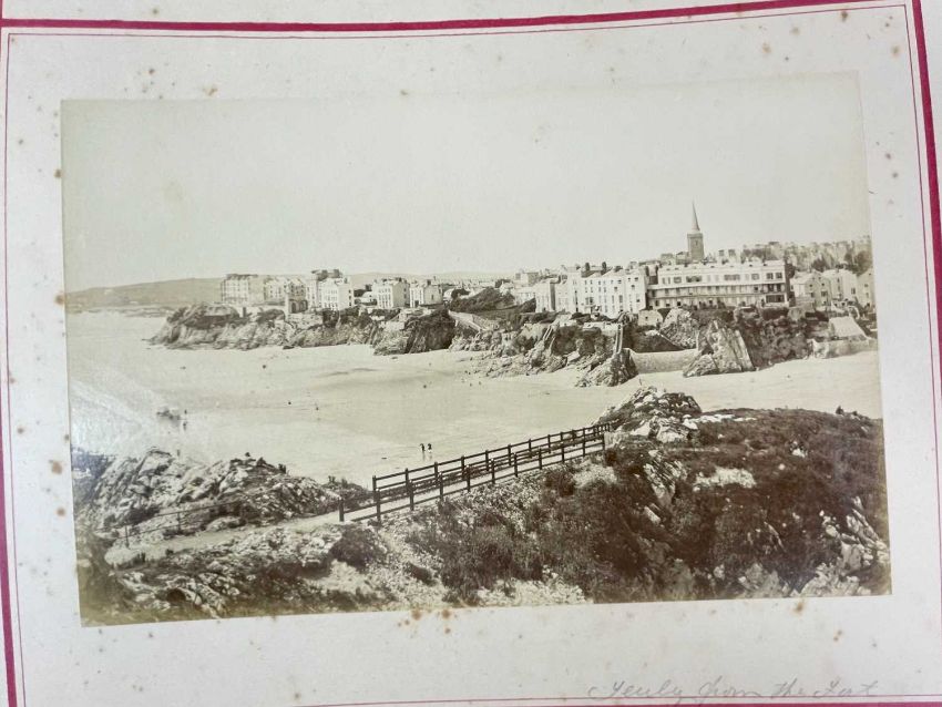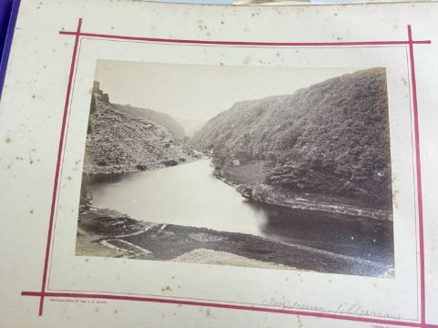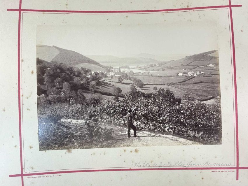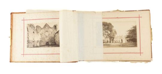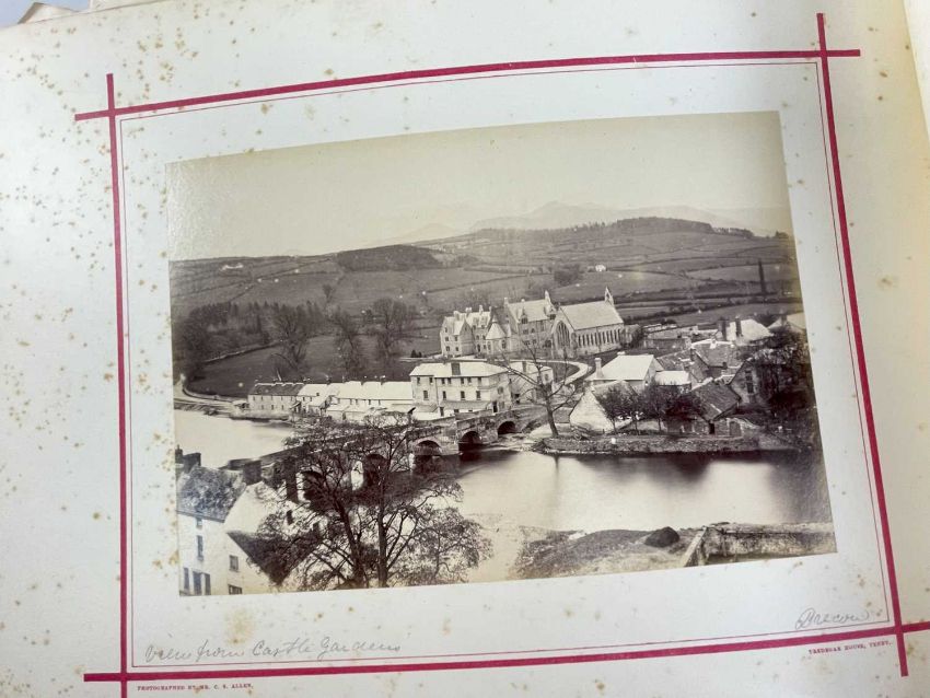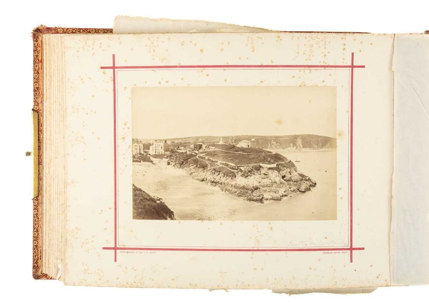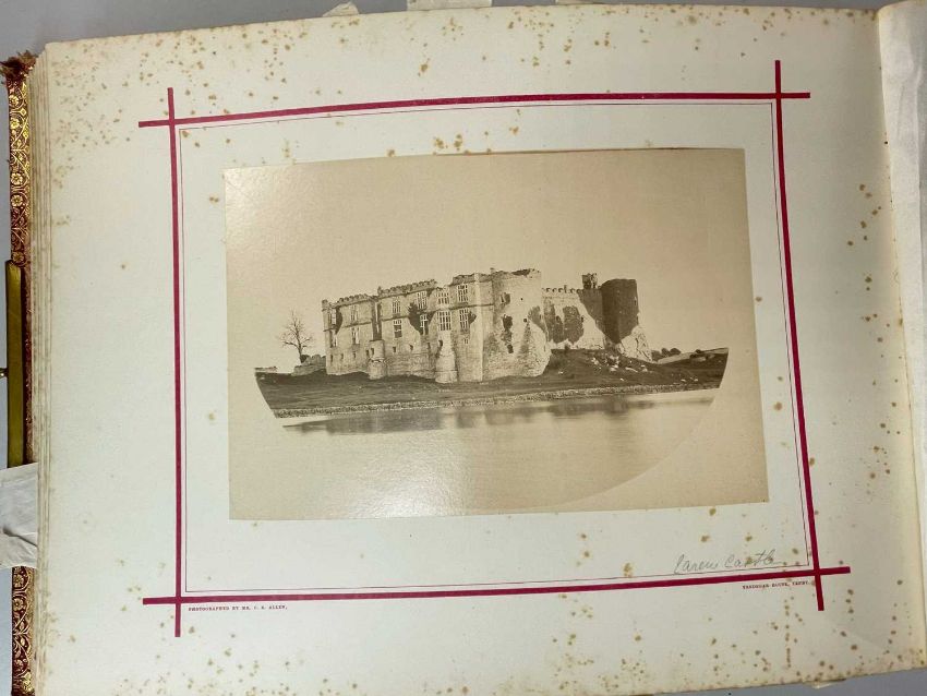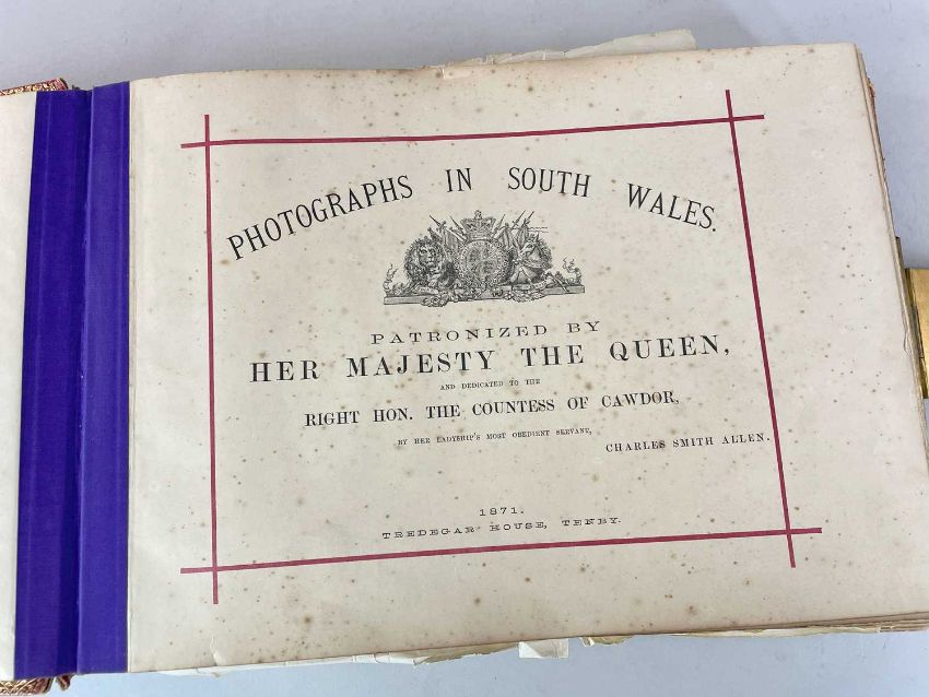 CHARLES SMITH ALLEN (1831-1897) of Tenby, documentary photographs, circa 1860s - rare album having gilt decoration and title to brass clasped red Morocco 'Photographs in South Wales', contains fifty pages of mounted photographs showing scenes and great houses in south Wales and a final photograph of Welsh costume, each with titles inscribed in pencilAuctioneer's Note: Smith Allen was a pioneer photographer in Wales and renowned as the finest of Tenby's early camera artists. Born in Rugeley, Staffordshire, in 1831, a few surviving paper negatives show that he was recording Tenby in silver towards the end of the 1840s. He set up business in Tenby, buying the old Assembly Rooms and building his 'Excelsior Studios' on to it. This had a fully equipped darkroom as well as a complex system of shutters and blinds which controlled the level of daylight that entered the studio. He often took photographs 'on location', having built himself a portable, horse-drawn darkroom. He also had a shop and studio, 'The Mortimer Studio', in Tredegar House, High Street, dealing in stationery, as well as a studio in Priory Street, Cardigan. Allen photographed all over Wales and this album is one of many produced by him for individual customers.Provenance: consigned by Gregynog Trust (surplus to requirements as unconnected to the heritage of Gregynog Hall)Comments: foxing to mounts but photographs generally clear of foxing and in good overall condition