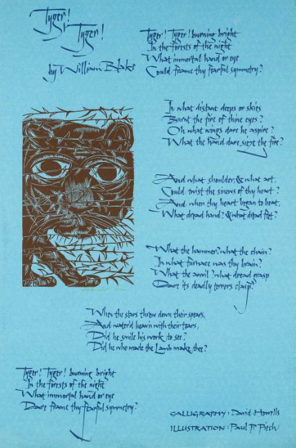 ‡ PAUL PETER PIECH (American, lived / worked Wales 1920-1996) limited edition (1/75) two colour lithograph - 'Tyger Tyger' by William Blake, signed and dated 1972, 77 x 52cmsProvenance: Bertrand Russell Peace Foundation, gifted to the organisation by the artist, proceeds assist with renovations of Bertrand Russell's former home in CornwallComments: small 10mm tear bottom edge, unframed