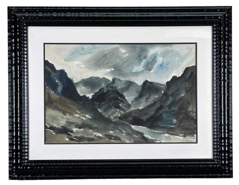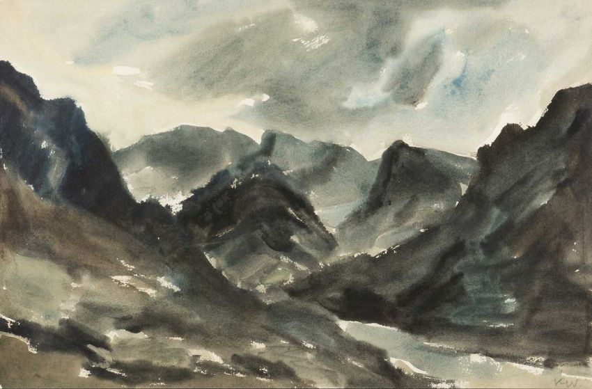 ‡ SIR KYFFIN WILLIAMS RA (Welsh 1918-2006) watercolour - Eryri peaks and clouds, signed with initials, 36 x 55cmsProvenance: private collection LondonComments: framed and glazed, ready to hangFree Delivery: bidders with invoices over £4000 in this Welsh Sale can benefit from free insured delivery to their home (England and Wales only). To enquire about this service, please email brj@rjauctions.co.uk