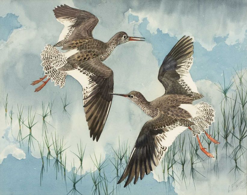 ‡ CHARLES FREDERICK TUNNICLIFFE RA OBE (English, worked Wales 1901-1979) watercolour - titled verso 'April Redshanks', The Tryon Gallery Ltd label, signed in ink lower right, 43 x 54cmsProvenance: private collection GwyneddComments: framed and glazed, ready to hang