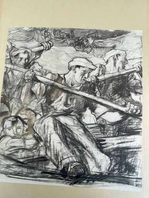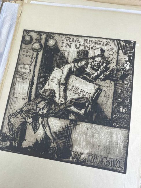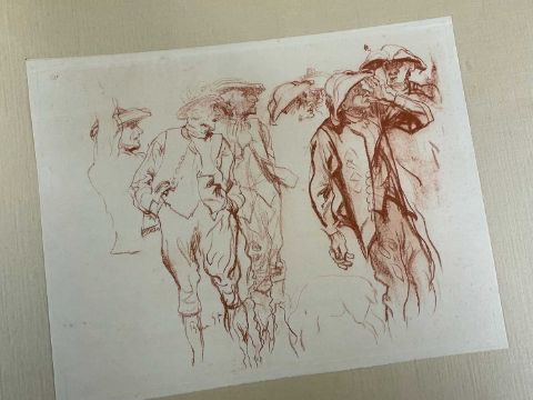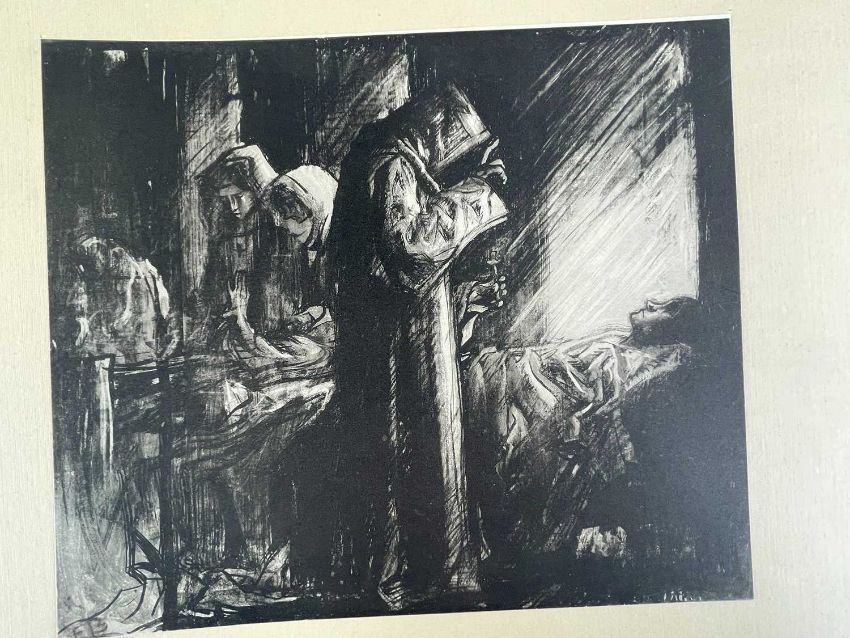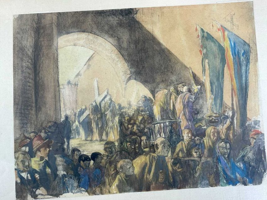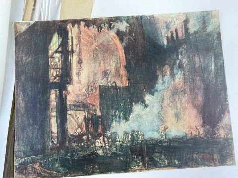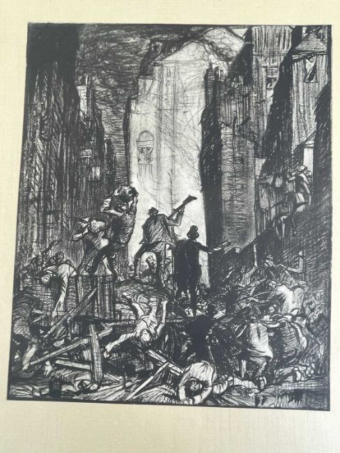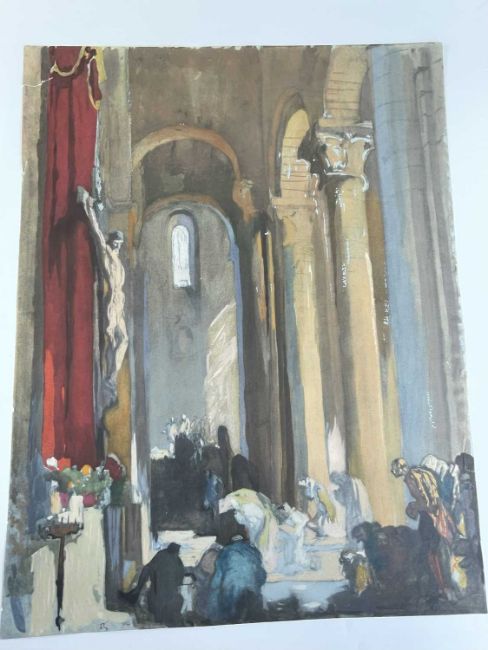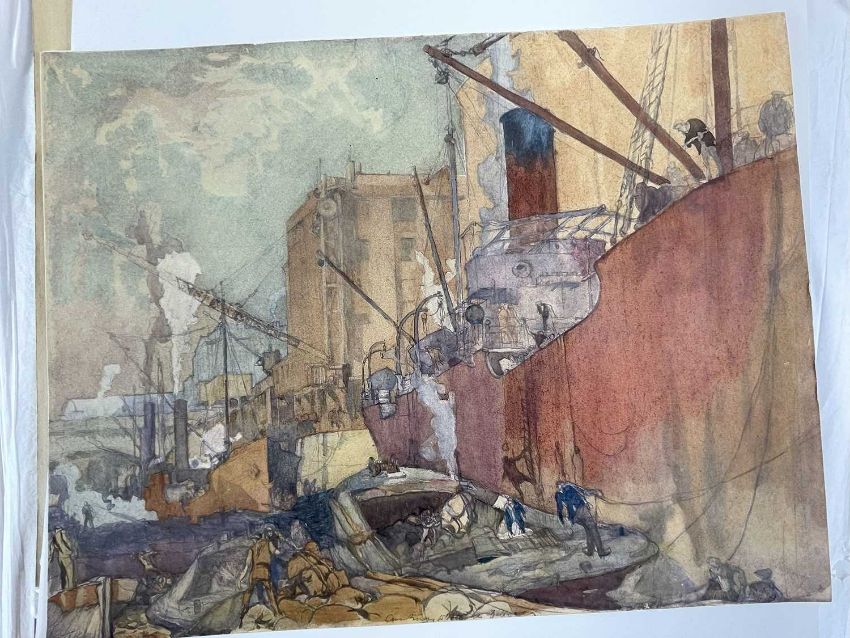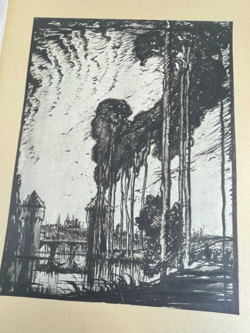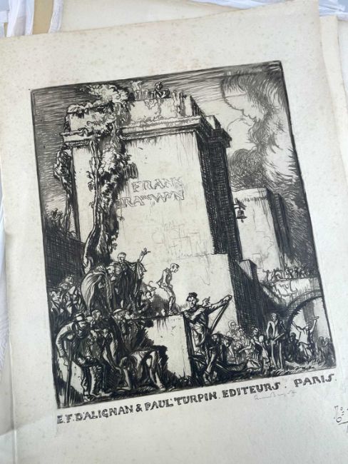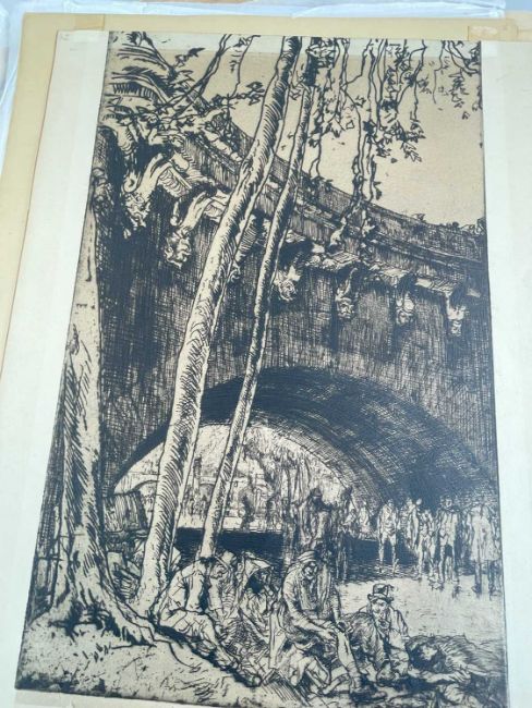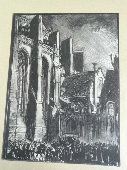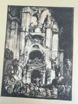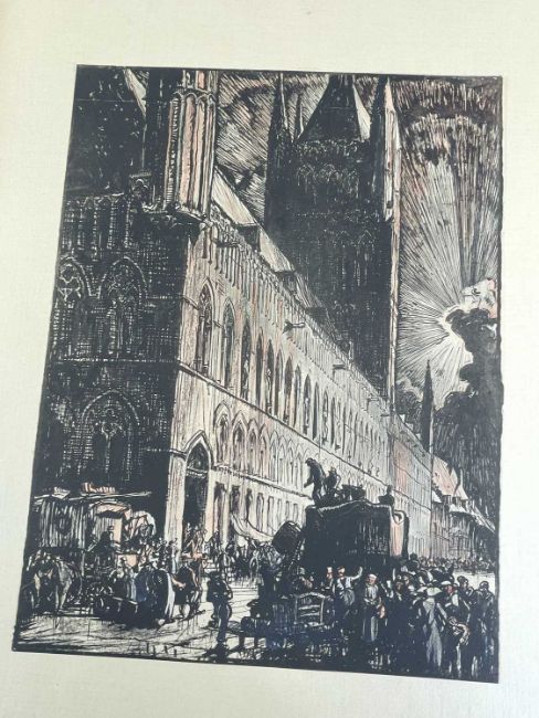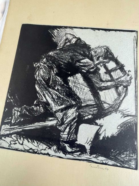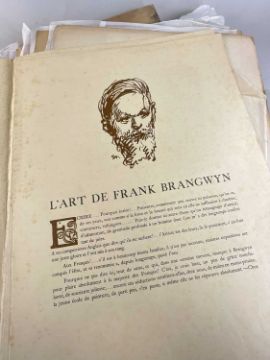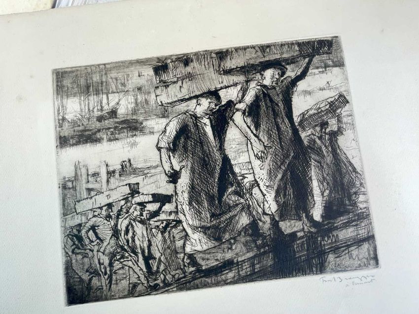 SIR FRANK BRANGWYN RA HRSA RSW RWS PRBA RE HRMS ROI (Welsh 1867-1956) from The Brangwyn Portfolio of lithographs, with additional etchings, 1927, published by E F d'Alignan and Paul Turpin, to include Title page signed in pencil and numbered 77/120, 'Billingsgate Fishporters', 'Interior of the Church of St. Hilaire', 'Unloading', 'Man Sawing Wood', 'Christ Carrying the Cross to Calvary' etc., various sizes, some mounted on card (contained in an original portfolio), smallest 28 x 35cms to largest 55 x 35cms (39)Provenance: private collection SwanseaComments: folio case loose from cloth spine and folds, cover tinted with scuffs and marginal bumps, some with marginal mounting adhesive, some unmounted/loose, some signed in pencil, some with corner damage, incomplete, inspection advised, all prints photographed.