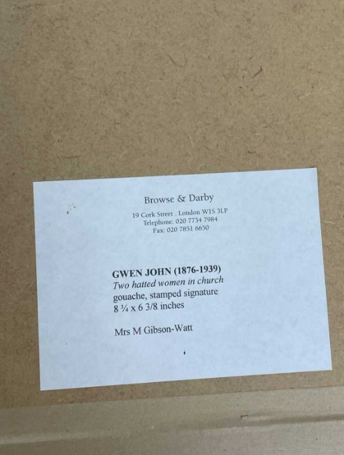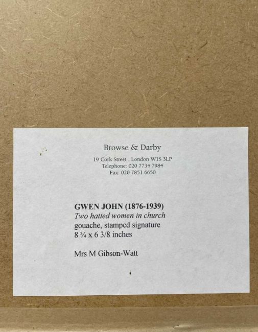 GWEN JOHN (Welsh 1876 - 1939) watercolour and body colour - entitled verso 'Two Hatted Women in Church', signed, circa 1920s, 22 x 17cmsAuctioneer's Note: most likely the two figures are wearing hats for a church service as with 'Girls in a Church' (Yale Center for British Art), which was painted in the 1920s. In 'Gwen John and Augustus John' (Tate Publishing, 2004) the author writes, ' In Gwen John's church watercolours one or several female figures are seen, usually from the rear, in what is essentially a private moment. She did these watercolours from the early 1910s until she ceased working twenty years later. Gwen would sit in the back of the Meudon church, sketching in pencil adding watercolour or bodycolour in the studio. When criticised for working in church she responded (in French) ' I like to pray in Church like everyone but my spirit is not capable of praying for a long time at once - if I remove all that time there would not be enough happiness in my life'Provenance: private collection Powys, label verso for Browse & Darby, Cork Street, London, 2005 receipt for the sameFree Delivery: bidders with invoices over £4000 in this Welsh Sale can benefit from free insured delivery to their home (England and Wales only). To enquire about this service, please email brj@rjauctions.co.uk