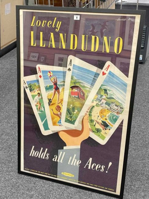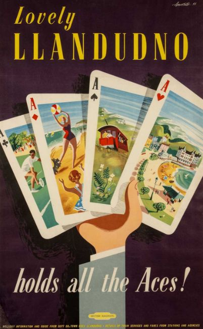 ANDRE AMSTUTZ (British fl.1950s) FOR BRITISH RAILWAYS (LONDON-MIDLAND REGION) 1952 platform poster laid to linen - entitled 'Lovely Llandudno Holds All the Aces!', printed with signature and date by McCorquodale & Co, 100 x 65cmsProvenance: private collection CeredigionComments: later framed and glazed Condition Report:There is some damage to two corners, it looks like water damage (see attached) bottom left corner and top left corner.There are fold lines as probably issued.No other damage.Colours look fine.