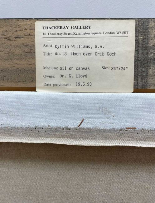 ‡ SIR KYFFIN WILLIAMS RA (Welsh 1918-2006) oil on canvas - entitled verso on Thackeray Gallery label, 'No. 18 Moon Over Crib Goch', signed with initials, 59.5 x 59.5cmsProvenance: private collection London, date purchased '19.5.93' as per label, same ownership sinceComments: framed, ready to hangFree Delivery: bidders with invoices over £4000 in this Welsh Sale can benefit from free insured delivery to their home (England and Wales only). To enquire about this service, please email brj@rjauctions.co.uk