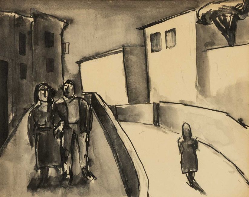‡ JOSEF HERMAN (Polish, lived Wales 1911-2000) ink & wash - entitled verso on Albany Gallery label verso 'Village Scene', 19 x 24cmsProvenance: private collection SwanseaComments: framed and glazed