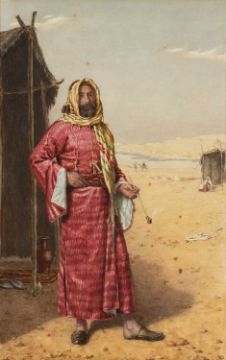 DOROFIELD HARDY (British 1853-1937) watercolour - entitled verso 'A Sheik' smoking pipe in desert settlement, camel and figures in distance, signed and dated 1884, 44 x 28cmsProvenance: private collection PembrokeshireComments: slight foxing in sky, hand-written label verso, framed and glazed