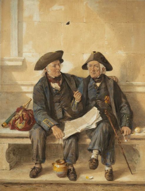OCTAVIUS OAKLEY (English 1800-1867) watercolour - Greenwich Pensioners discussing the merits of the Crimean War, 61.5 x 46cmProvenance: private collection LondonComment: framed and glazed ready to hang.