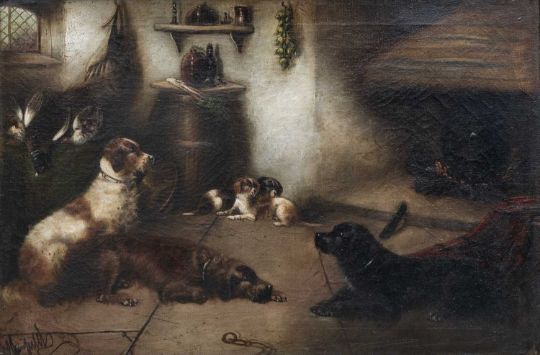 GEORGE ARMFIELD (English 1808-1893) oil on canvas - retrievers and spaniels in a cottage interior with cauldron in the fire, signed, 49.5 x 75cmsProvenance: private collection CaerphillyComment: narrow frame repainted, old craquelure