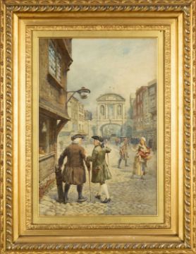 HENRY REYNOLDS STEER (English 1858-1928) watercolour - 'Drs. Johnson and Goldsmith at Temple Bar', signed, titled on label verso, 55 x 37cmsProvenance: with Royal Institute of Painters in Watercolours, private collection CardiffComments: slightly faded, otherwise framed ready to hang, label verso inscribed no.1 (loose/torn)