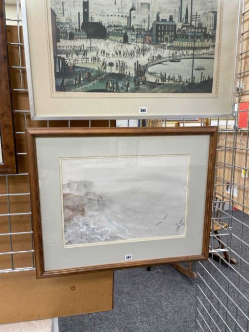 ‡ WINIFRED NICHOLSON (English 1893-1981) watercolour, gouache and colour pencil - seabirds and coast, probably St Ives, 1970, 34 x 49cmsAuctioneers Note: from as early as 1950, Winifred Nicholson had ‘made friends with a lot of wild seabirds, watching them fly and soar and sink on to the sea’ [letter to her son]. In 1970, when she had developed her idiosyncratic Impressionist style, she writes to her daughter: ‘Does it rain all the time? No indeed we have not had a drop the whole month I have been here, and each day is bluer than the last. There have only been two half days of cloud – I find continuous blue calm difficult to paint. One feels inclined to lie on a cliff in the warm sun smelling the scent of the Rowan blossom and watching the great sea birds wheeling and coasting in the blue sparkling gulf of sky before one alights on the blue sparkling sea.’ From Christopher Andreae Winifred Nicholson (Lund Humphries, 2009). The Tate staged a Winifred Nicholson retrospective exhibition in 1987.Provenance: Abbott and Holder, London 1990s; Professor Ritchie Ovendale, Aberystwyth; Private Collection, Ceredigion, 2023.Comments: framed and glazed