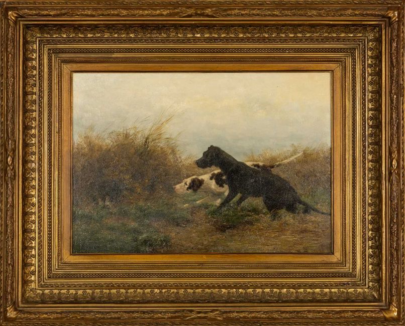 NELSON GRAY KINSLEY (English 1863-1945) oil on canvas - gundog pair stalking grouse in cover, signed and dated '87, 29 x 42cmsProvenance: private collection Rhondda Cynon TaffComments: framed, ready to hang, Frankfurt gilders label verso Dimensions: 100 Qty: 200