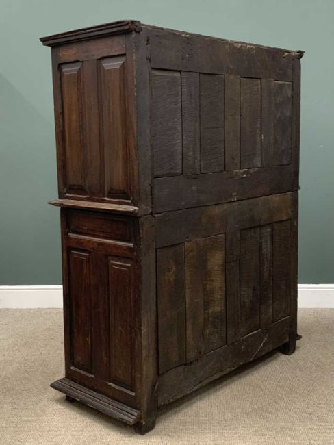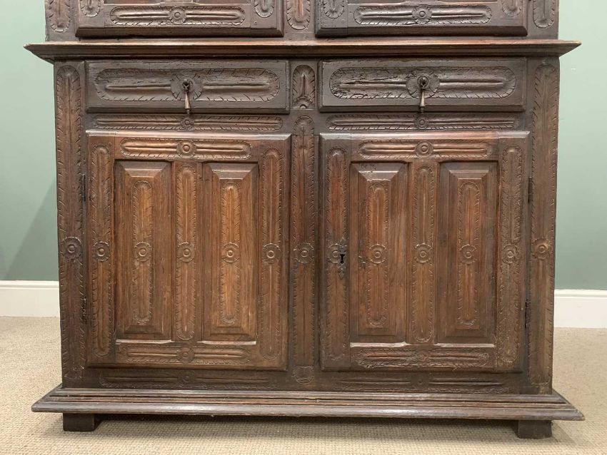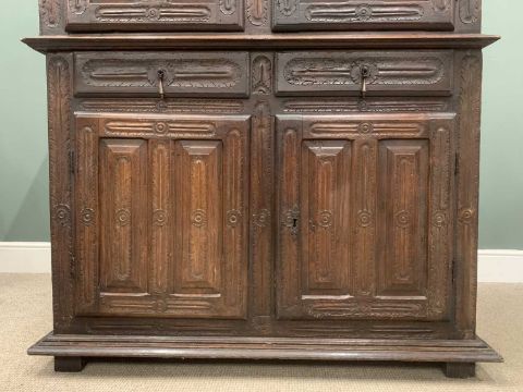19TH CENTURY OAK CARVED CUPBOARD with four doors and two central drawers, 165 (h) x 128 (w) x 57cms (d)Provenance: private collection Conwy