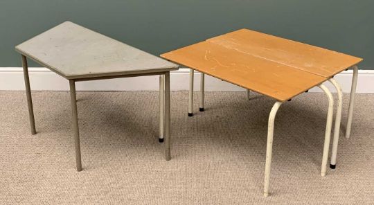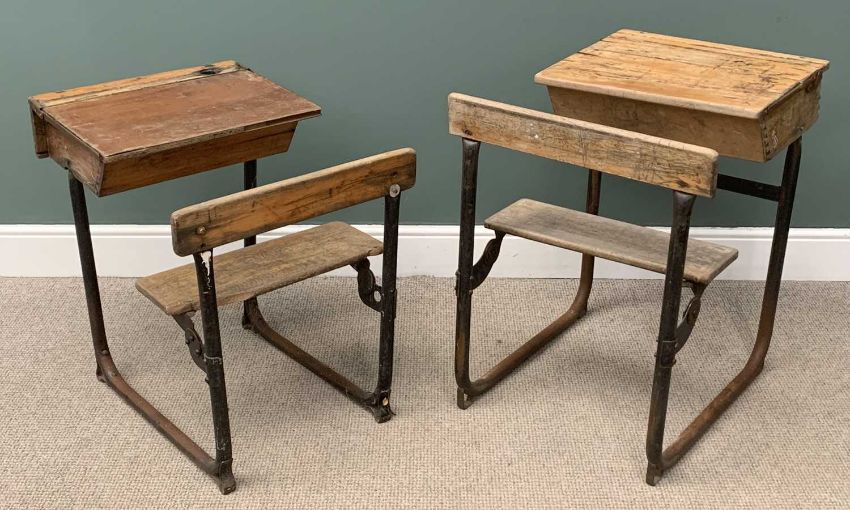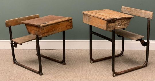 VINTAGE SCHOOL CLASS FURNITURE to include two desks/benches and stacking chairsProvenance: private collection Conwy