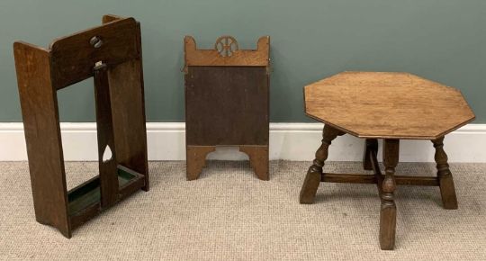 PLUS LOT 19 - THREE SMALL ITEMS OF FURNITURE including a Homettes Arts & Crafts stickstand with drip tray, bears label, 71 (h) x 39 (w) x 29cms, single door wall cabinet and an oak side tableProvenance: private collection Conwy