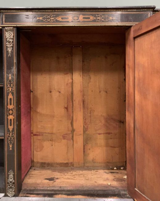 PLUS LOT 11 - CHINA CABINET & CREDENZA the ebonised and inlaid credenza with central opening door, 105 (h) x 147 (w) x 37cms (d) and a demi-lune China cabinet with rail back and ball and claw feet, 136 (h) x 103 (w) x 40cms (d)Provenance: private collection Conwy