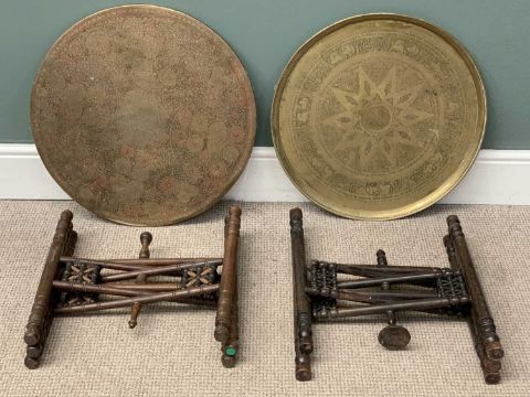 FOUR SMALL ITEMS OF FURNITURE including two Benares brass coffee tables, beaten-copper top table, 39 (h) x 90 (w) x 44cms (d) and a brass fire screenProvenance: private collection Conwy