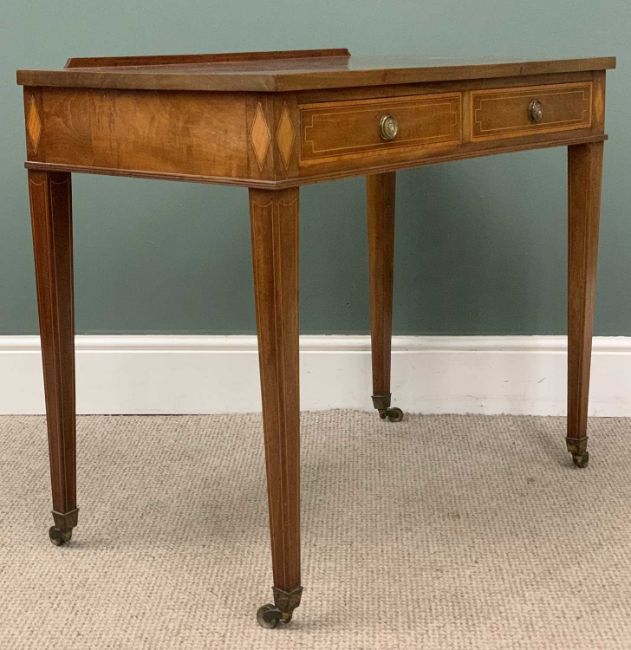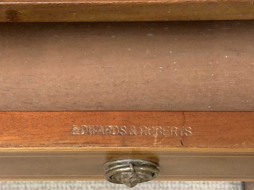 EDWARDS & ROBERTS SIDE TABLE with two drawers, inlay and on tapered supports with casters, stamped 'Edwards and Roberts', 76 (h) x 90 (w) x 53cms (d)Auctioneer's Note: founded in 1845, Edwards and Roberts became synonymous with high quality furniture, both as cabinet makers, producing items to a very high standard using the finest timbers, and as 'Importers of Ancient Furniture'.Their cabinet makers produced contemporary items as well as reproductions of earlier English and French pieces, favouring Georgian designs and satinwood marquetry. They were also known for adapting and restoring fine quality items worthy of their stamp. By the late 19th century Edwards & Roberts was one of the leading firms of English cabinetmakers.With the advent of the First World War in 1914, the business expanded to support the war effort, opening a second lens making facility in London supported by a telescope factory in Watford.After the war the business went from strength to strength for a few decades before a steady decline through the '50s and '60s when, by the end of the decade, the business had receded back into Telescope House, closing all other factories.Provenance: private collection Anglesey