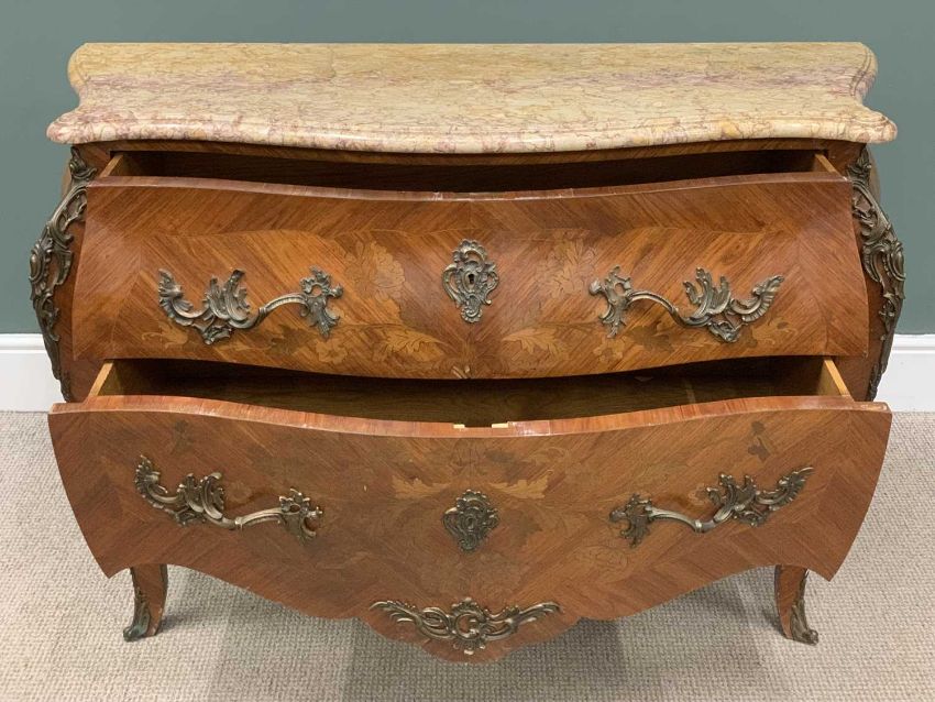 LOUIS XV STYLE FRENCH BOMBE CHEST, two drawers, marble top, marquetry detail, 85 (h) x 135 (w) x 53cms (d)Provenance: private collection Conwy