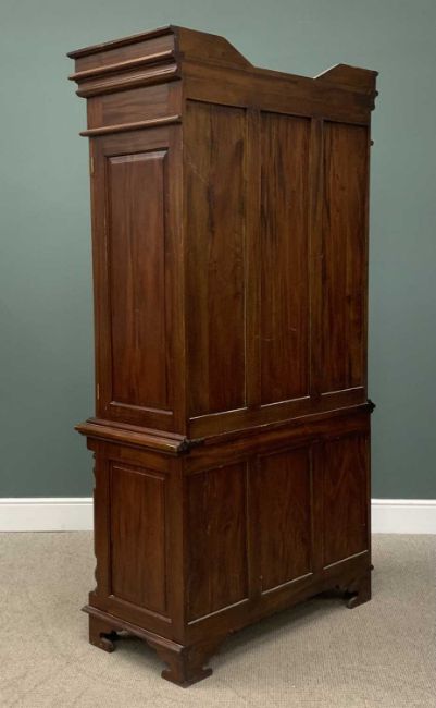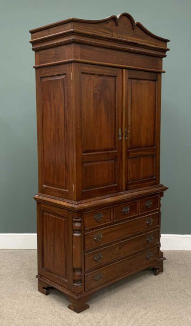 REPRODUCTION HARDWOOD PRESS CUPBOARD, the top with twin cupboard doors and interior shelves, the base with three small over three long drawers, 223 (h) x 110 (w) x 54cms (d)Provenance: private collection Conwy