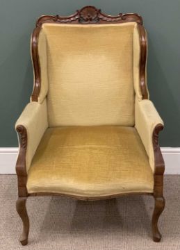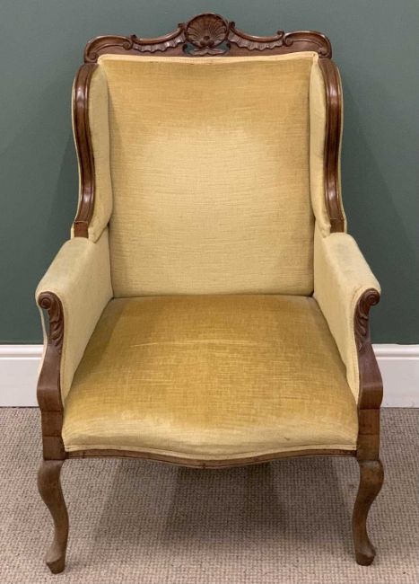 TWO SIMILARLY UPHOLSTERED ANTIQUE ARMCHAIRS with a carved rail back and similarly upholstered carved spoon back armchair, 101cms (h) the tallestProvenance: private collection Anglesey
