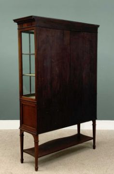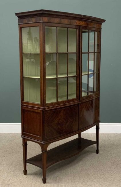 EDWARDIAN MAHOGANY DISPLAY CABINET, fine bow front example with dentil cornice, inlay detail, base shelf on spayed supports, 174 (h) x 116 (w) x 44cms (d)Provenance: deceased estate Denbighshire