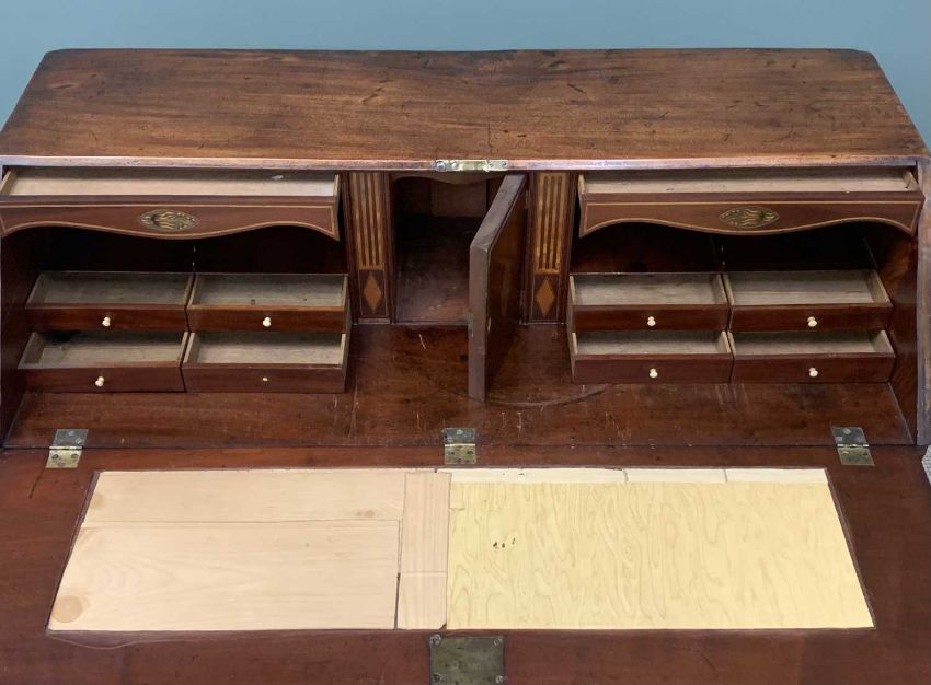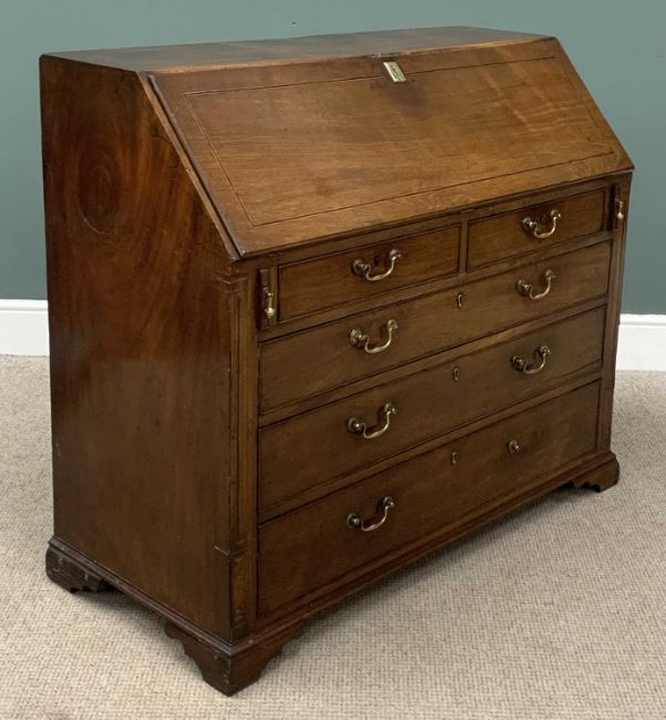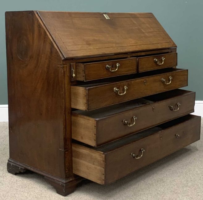 GEORGIAN MAHOGANY BUREAU, fine example with fitted interior, two over three drawers on bracket feet, 104 (h) x 119 (w) x 54cms (d)Provenance: deceased estate DenbighshireGOV.UK Ivory content- to comply with current regulation - self-declaration form completed for the sale of this item - Submission reference KE7VKBHC
