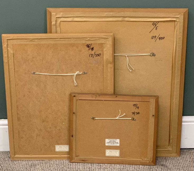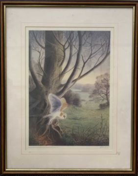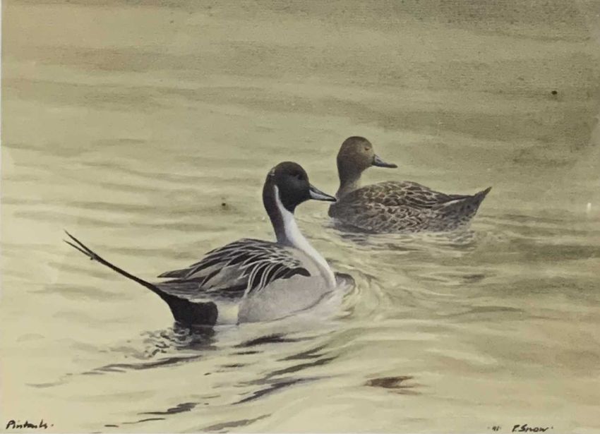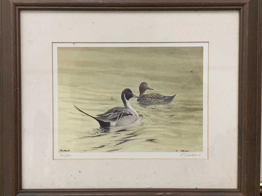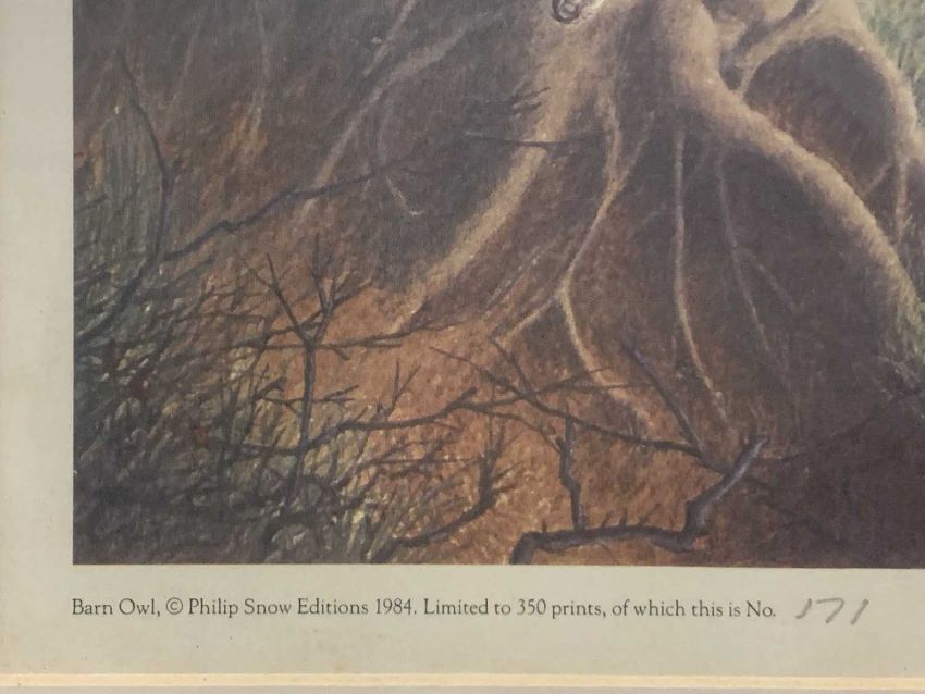 PHILIP SNOW (British b.1947) limited edition prints (3) - bird of prey perched on rock (109/850), signed in pencil, 48 x 37cms, barn owl, signed in pencil, 42 x 30cms and two swimming ducks (38/300), signed in pencil, 17 x 23cms