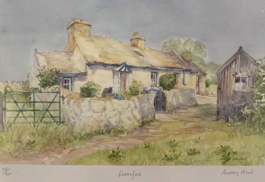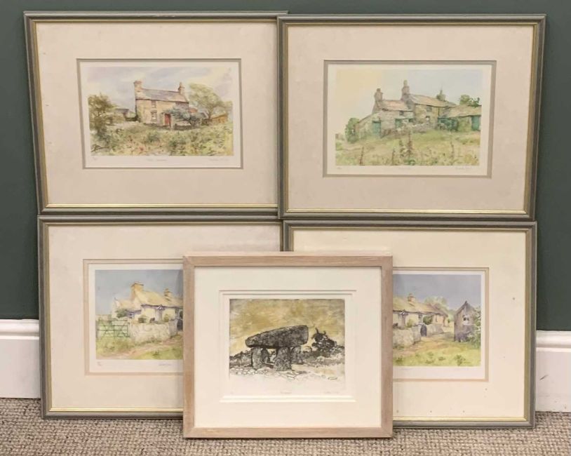 AUDREY HIND (British b.1936) artist proof print - standing stones titled 'Tyr Newydd', signed in pencil, 19.5 x 24cms and four limited edition signed prints, signed in pencil of country dwellings, 22 x 30cms, all approx. same size