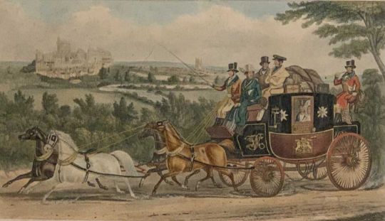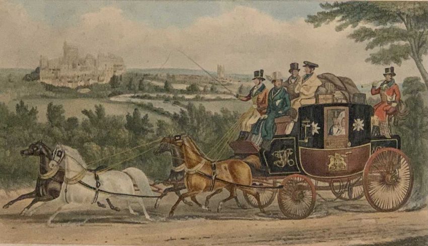 AFTER WILLIAM DAY & CHARLES HUNT engravings - 19th Century view of Bangor, Wales, with steam locomotive (William Day) approaching station, 33 x 45cms and a coaching print 'The Birth Day Team', (Charles Hunt) 54.5 x 74cmsProvenance: private collection Conwy Provenance:en