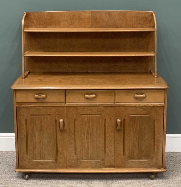 LIGHT OAK MID-CENTURY DRESSER in the style of Ercol, the rack with two shelves above a three drawer over three cupboard door base, 131 (h) x 123 (w) x 50cms (d)Provenance: private collection Conwy