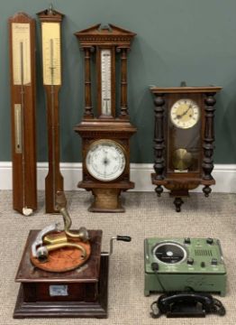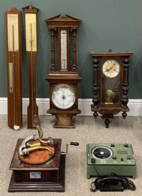 GROUP OF MECHANICAL COLLECTABLES including wall clocks, old telephone, 'Sailor' VHF radio telephone, Halda Limited transport meter etc. (13 items)Provenance: private collection Conwy