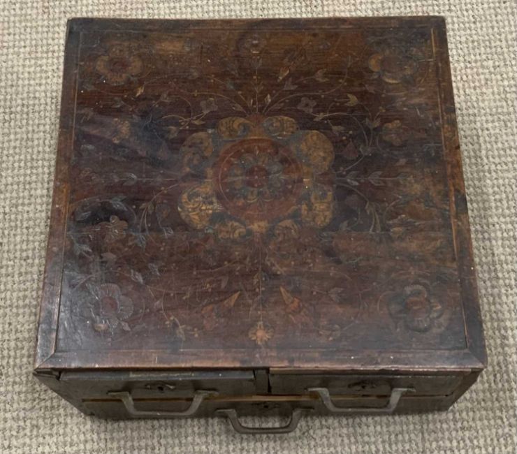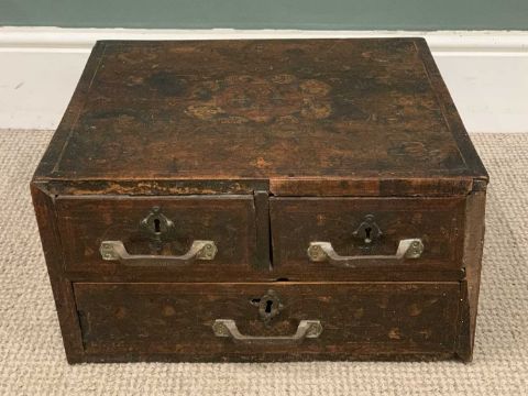 VINTAGE THREE DRAWER CASH BOX with poker work detail, 22.5 (h) x 45.5 (w) x 42cms (d)Provenance: private collection Conwy