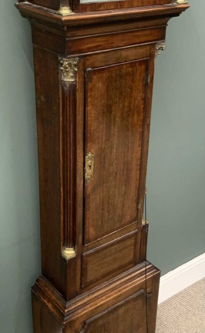 EARLY 19TH CENTURY OAK & MAHOGANY LONGCASE CLOCK with 8 day movement, swan neck pediment, rolling moon dial, marked 'T. Wilcockson of Denbigh', with key, weights and pendulum, 228cms (h)Provenance: private collection Conwy