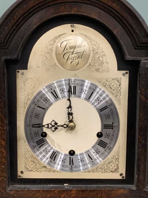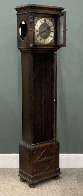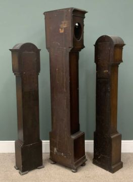 THREE VARIOUS LONGCASE CLOCKS comprising oak encased with silvered dial and Westminster chime, 180cms (h) and two similar period oak grandmother clocks