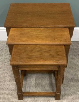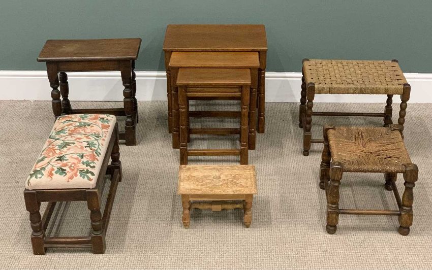 VARIOUS VINTAGE STOOLS & SMALL TABLES to include oak peg joined type, nest of three coffee-tables etc.Provenance: private collection Conwy