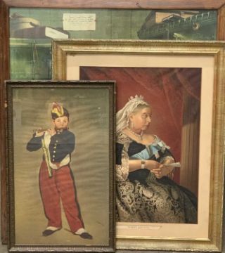 ENGLISH SCHOOL three prints - historical portraits of Queen Victoria, 59.5 x 44.5cms, marching boy with flute, 60 x 35cms, Continental gentleman, 87 x 76cmsProvenance: private collection Conwy
