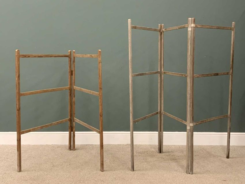 VINTAGE FURNISHING ITEMS to include wooden airers, timber barrel lid, circa 1900 three fold dress screen, 145 (h) x 182cms, wall panels, etcProvenance: private collection Conwy