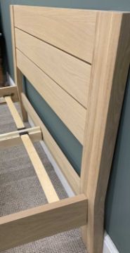 MODERN LIGHT OAK EFFECT DOUBLE BED FRAME, 4ft 6in, rarely used and with mattress, 104 (h) x 146 (w) x 202cms (d)Provenance: private collection Conwy