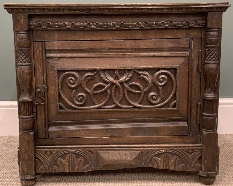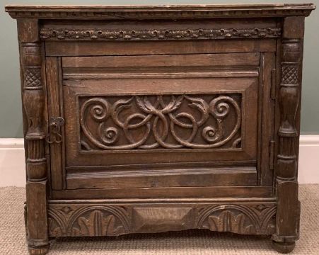 SMALL CARVED OAK CUPBOARD having a single door, 57 (h) x 66 (w) x 41cms (d)Provenance: private collection Conwy