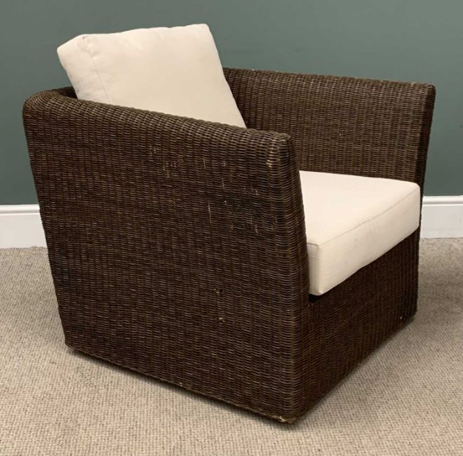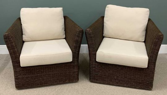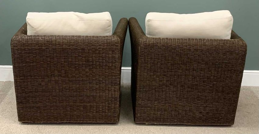 MODERN PAIR OF GARDEN ARMCHAIRS in rattan/wicker effect, upholstered cushionsProvenance: private collection Conwy