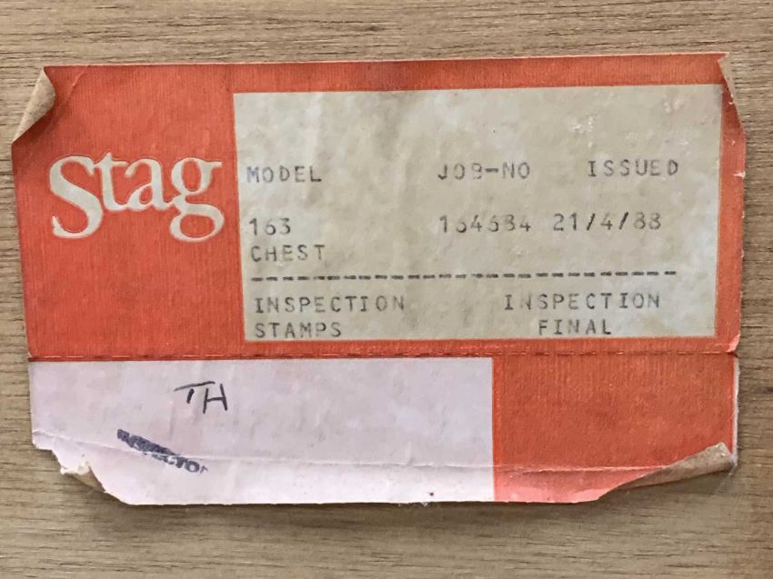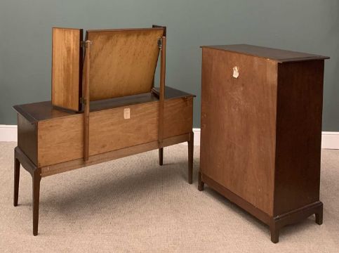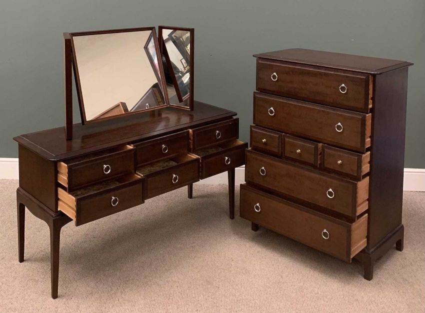 STAG MINSTREL BEDROOM FURNITURE comprising dressing table with triple mirror and six drawers, 127 (h) x 131 (w) x 47cms (d), tall multi chest of drawers, 113 (h) x 82 (w) x 47cms (d) and two bedside chests of drawers, 72 (h) x 53 (w) x 47cms (d)Provenance: private collection Conwy