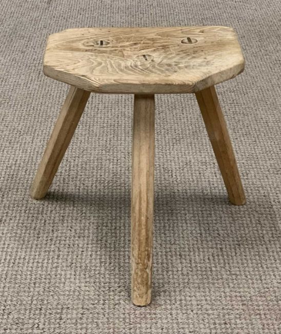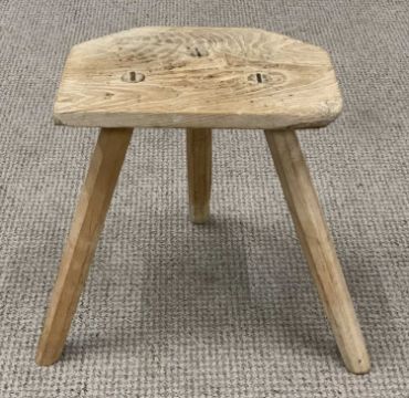 RUSTIC THREE LEGGED OAK MILKING TYPE STOOL, 35 (h) x 42 (w) x 32cms (d)Provenance: private collection Gwynedd