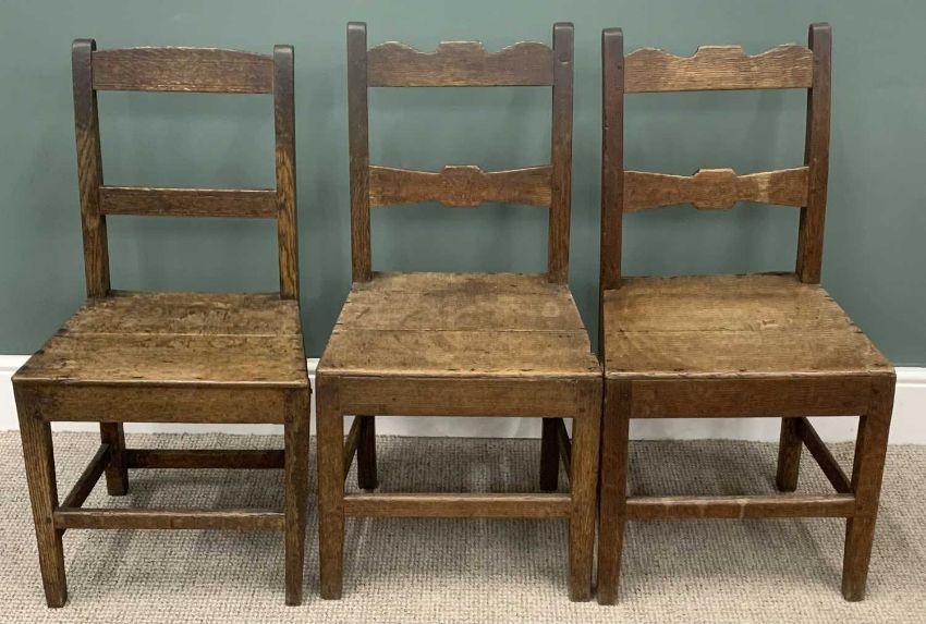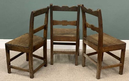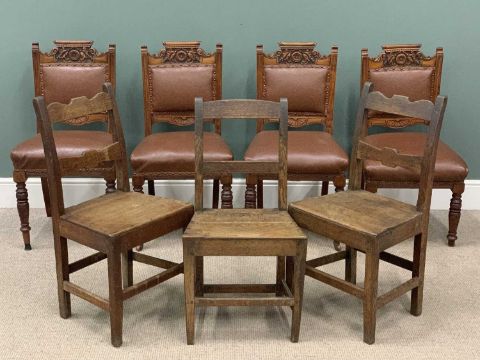 TWO PART-SETS OF CHAIRS comprising set of four carved back and rexine covered dining chairs and three farmhouse chairs (7)Provenance: private collection Conwy