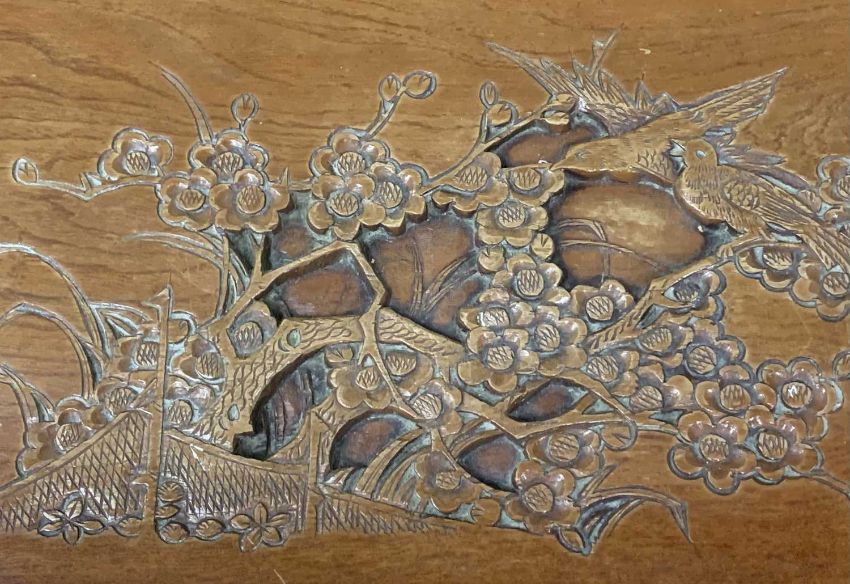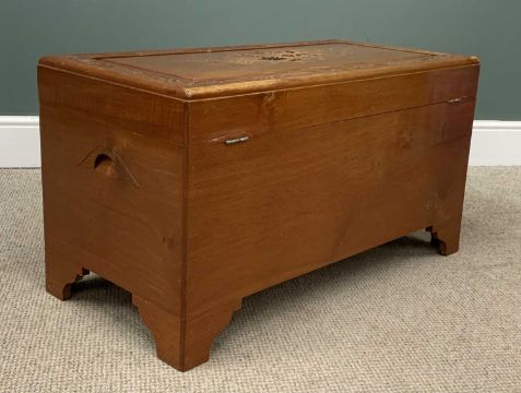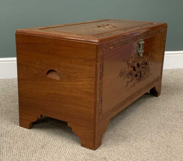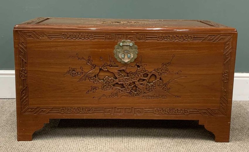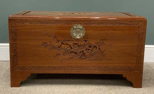 CHINESE CARVED CAMPHORWOOD CHEST having interior shelf and lock, 50 (h) x 92 (w) x 46cms (d)Provenance: private collection Gwynedd