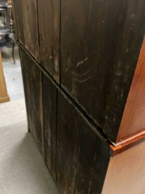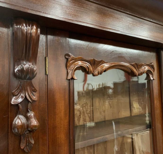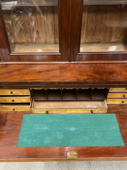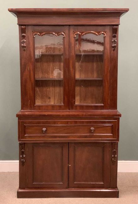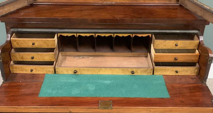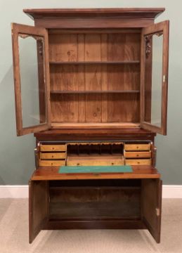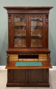 VICTORIAN MAHOGANY SECRETAIRE BOOKCASE having carved corbel details and upper door moulding, twin glazed upper doors, interior adjustable shelving, drop-down front, turned wooden knobs, burr walnut interior drawers and pigeonholes, double base doors, plinth base, 221 (h) x 121 (w) x 46cms (d)Provenance: private collection Denbighshire